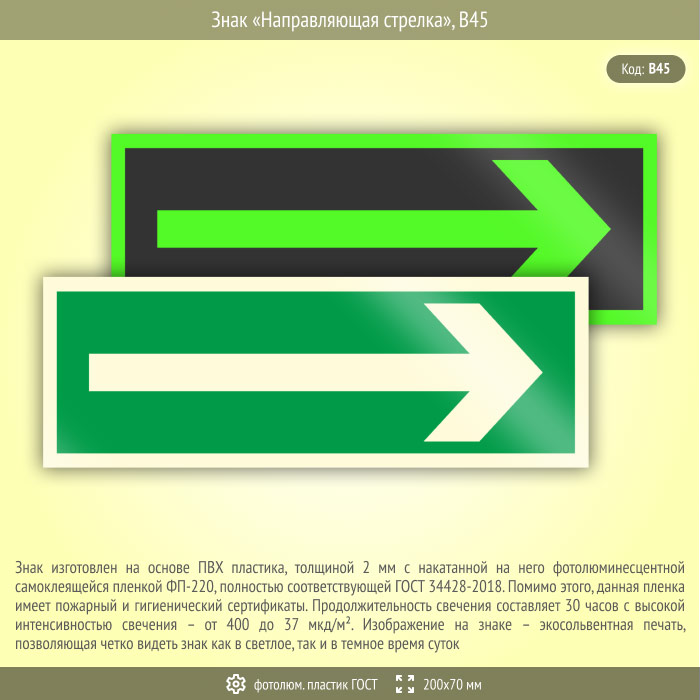 Знак «Направляющая стрелка», B45 на фотолюминесцентном пластике ГОСТ 34428-2018, размером 200х70 мм обозначает направление движения или эвакуации. Вспомогательные знаки и таблички полностью соответствуют современным требованиям и стандартам. Таблички с поясняющими надписями используются в качестве самостоятельного знака, либо в качестве дополнения к основному знаку безопасности