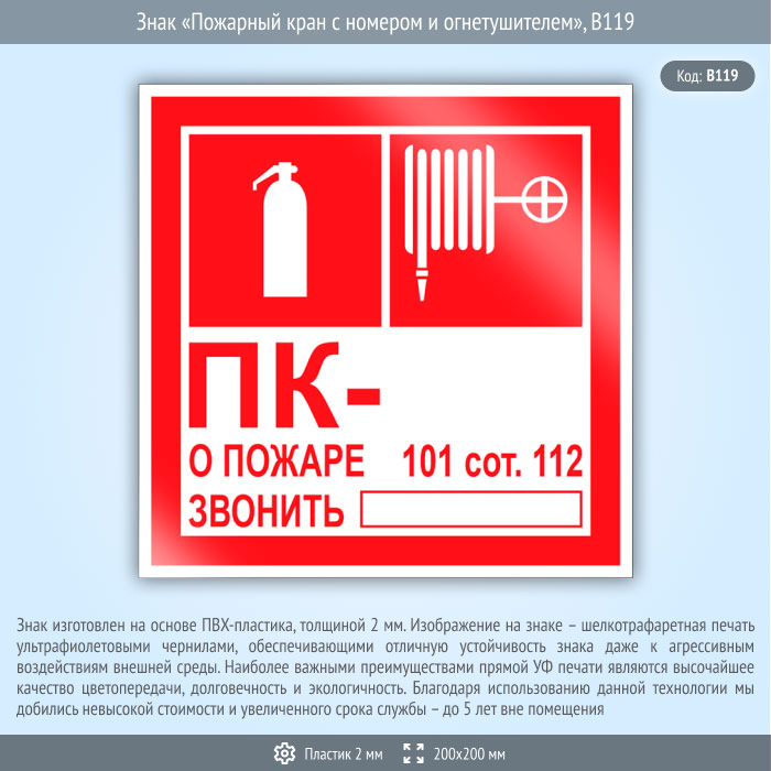 На комбинированном знаке «Пожарный кран с номером и огнетушителем», B119 на пластике, размером 200х200 мм имеются схематичные изображения пожарного крана и огнетушителя. Знак размещается непосредственно на пожарных шкафах. Также на знаке указывается порядковый номер пожарного крана (ПК) - например, при помощи самоклеящихся цифр. Вспомогательные знаки и таблички полностью соответствуют современным требованиям и стандартам. Таблички с поясняющими надписями используются в качестве самостоятельного знака, либо в качестве дополнения к основному знаку безопасности