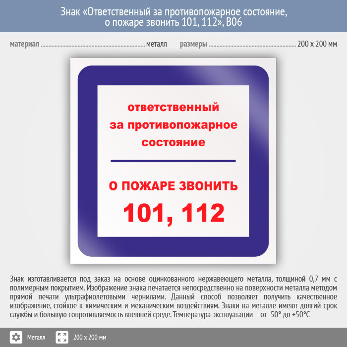 Знак «Ответственный за противопожарное состояние, о пожаре звонить 101, 112», B06 на металле, размером 200х200 мм предназначена для информирования об ответственном за противопожарное состояние и содержит телефоны для вызова пожарной службы. Вспомогательные знаки и таблички полностью соответствуют современным требованиям и стандартам. Таблички с поясняющими надписями используются в качестве самостоятельного знака, либо в качестве дополнения к основному знаку безопасности