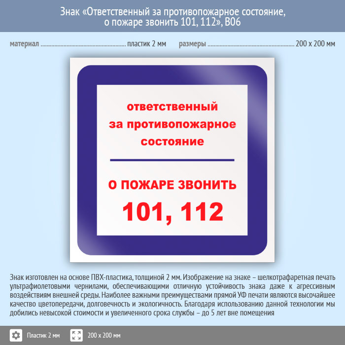 Знак «Ответственный за противопожарное состояние, о пожаре звонить 101, 112», B06 на пластике, размером 200х200 мм предназначена для информирования об ответственном за противопожарное состояние и содержит телефоны для вызова пожарной службы. Вспомогательные знаки и таблички полностью соответствуют современным требованиям и стандартам. Таблички с поясняющими надписями используются в качестве самостоятельного знака, либо в качестве дополнения к основному знаку безопасности