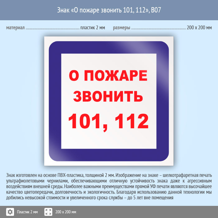 Знак «О пожаре звонить 101, 112», B07 на пластике, размером 200х200 мм предназначена напомнить о главных номерах пожарной службы. Вспомогательные знаки и таблички полностью соответствуют современным требованиям и стандартам. Таблички с поясняющими надписями используются в качестве самостоятельного знака, либо в качестве дополнения к основному знаку безопасности