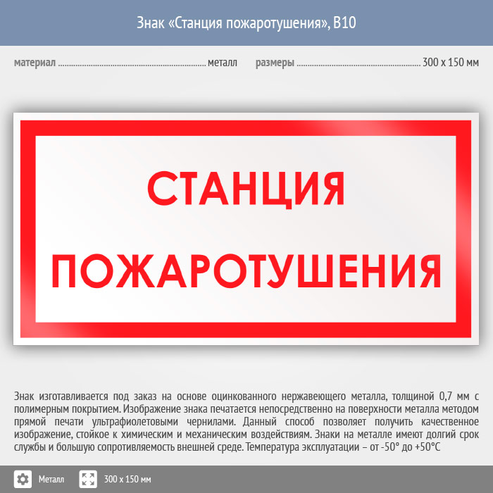 Знак «Станция пожаротушения», B10 на металле, размером 300х150 мм служит для обозначения расположения станции пожаротушения. Вспомогательные знаки и таблички полностью соответствуют современным требованиям и стандартам. Таблички с поясняющими надписями используются в качестве самостоятельного знака, либо в качестве дополнения к основному знаку безопасности