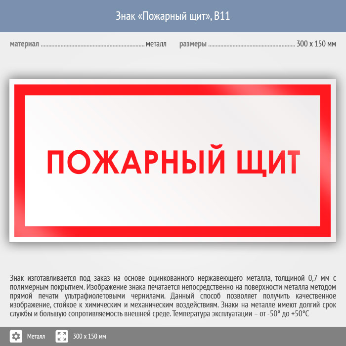 Знак «Пожарный щит», B11 на металле, размером 300х150 мм служит для обозначения расположения пожарного щита. Вспомогательные знаки и таблички полностью соответствуют современным требованиям и стандартам. Таблички с поясняющими надписями используются в качестве самостоятельного знака, либо в качестве дополнения к основному знаку безопасности