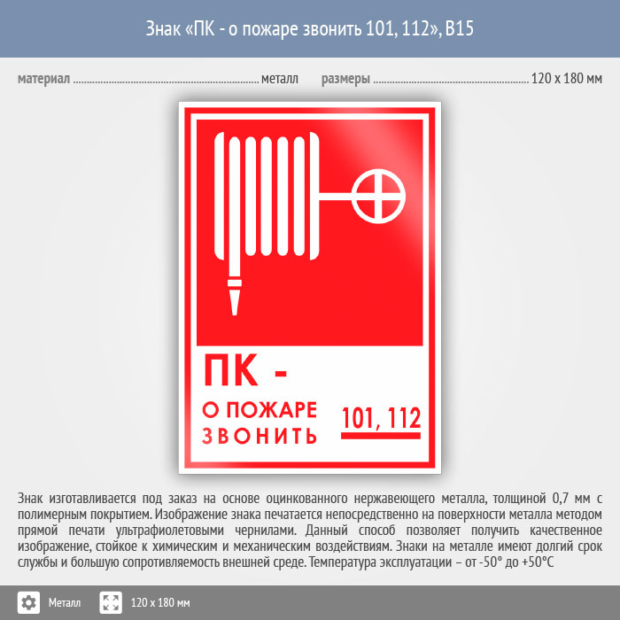 Знак «ПК - о пожаре звонить 101, 112», B15 на металле, размером 120х180 мм служит для обозначения расположения пожарного крана, а также содержит телефоны вызова пожарной бригады. Вспомогательные знаки и таблички полностью соответствуют современным требованиям и стандартам. Таблички с поясняющими надписями используются в качестве самостоятельного знака, либо в качестве дополнения к основному знаку безопасности