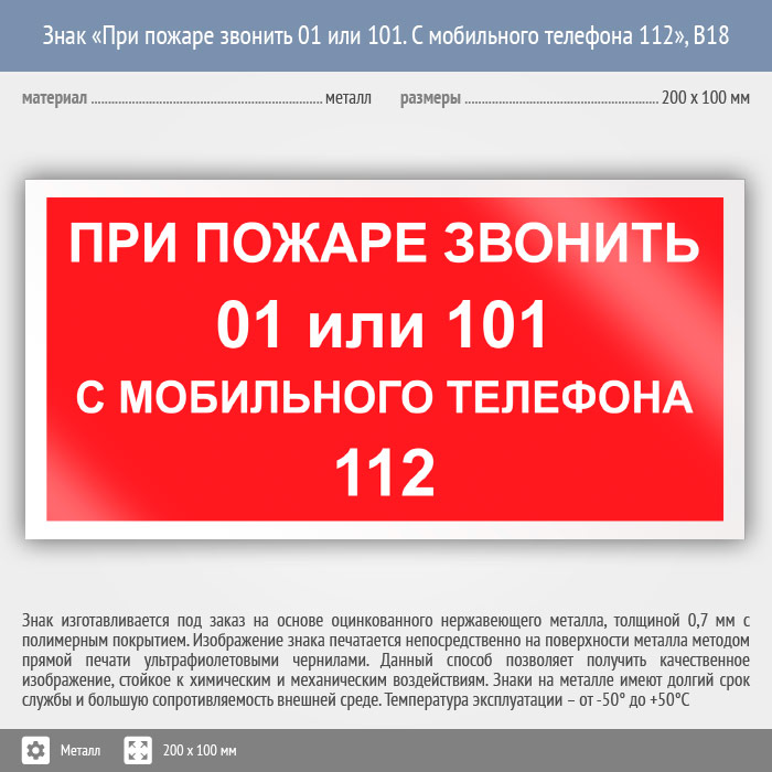Знак «При пожаре звонить 01 или 101. С мобильного телефона 112», B18 на металле, размером 200х100 мм предназначена напомнить главные номера пожарной службы с мобильного или городского телефона. Вспомогательные знаки и таблички полностью соответствуют современным требованиям и стандартам. Таблички с поясняющими надписями используются в качестве самостоятельного знака, либо в качестве дополнения к основному знаку безопасности