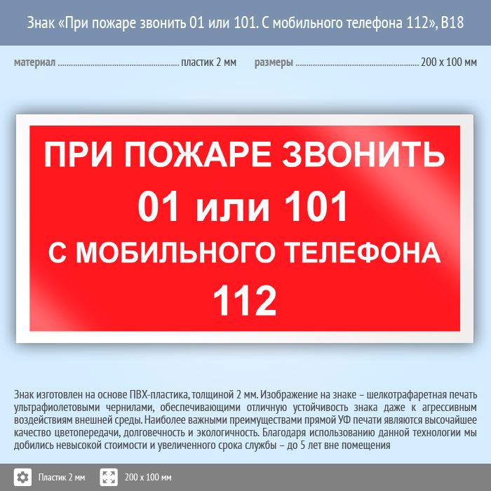 Знак «При пожаре звонить 01 или 101. С мобильного телефона 112», B18 на пластике, размером 200х100 мм предназначена напомнить главные номера пожарной службы с мобильного или городского телефона. Вспомогательные знаки и таблички полностью соответствуют современным требованиям и стандартам. Таблички с поясняющими надписями используются в качестве самостоятельного знака, либо в качестве дополнения к основному знаку безопасности