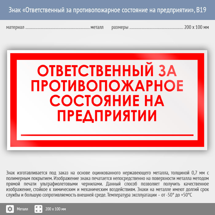 Знак «Ответственный за противопожарное состояние на предприятии», B19 на металле, размером 200х100 мм предназначена для информирования об ответственном за противопожарное состояние на предприятии. Вспомогательные знаки и таблички полностью соответствуют современным требованиям и стандартам. Таблички с поясняющими надписями используются в качестве самостоятельного знака, либо в качестве дополнения к основному знаку безопасности