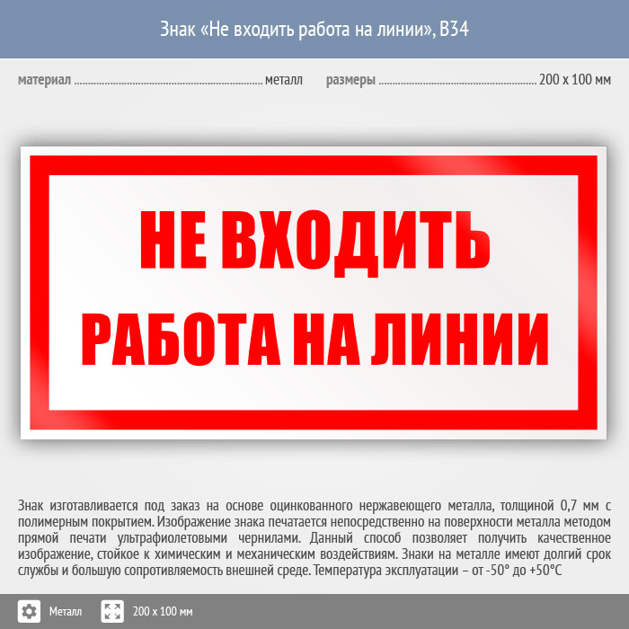 Знак «Не входить работа на линии», B34 на металле, размером 200х100 мм предупреждает о том, что идет работа и проход туда запрещен. Вспомогательные знаки и таблички полностью соответствуют современным требованиям и стандартам. Таблички с поясняющими надписями используются в качестве самостоятельного знака, либо в качестве дополнения к основному знаку безопасности