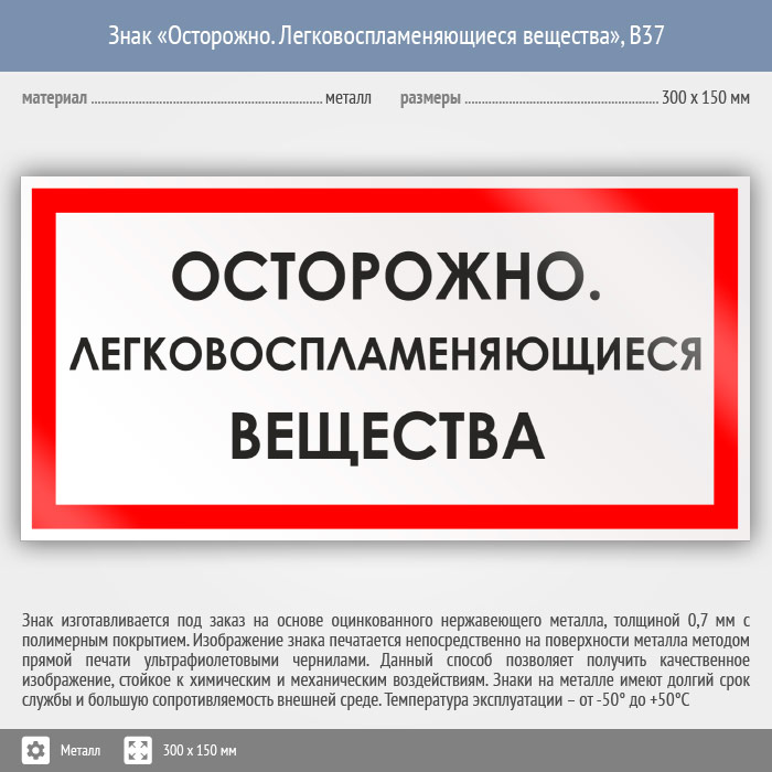 Знак «Осторожно. Легковоспламеняющиеся вещества», B37 на металле, размером 300х150 мм служит для обозначения горючих веществ, предупреждая о возможной опасности. Вспомогательные знаки и таблички полностью соответствуют современным требованиям и стандартам. Таблички с поясняющими надписями используются в качестве самостоятельного знака, либо в качестве дополнения к основному знаку безопасности