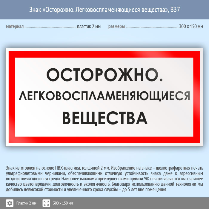 Знак «Осторожно. Легковоспламеняющиеся вещества», B37 на пластике, размером 300х150 мм служит для обозначения горючих веществ, предупреждая о возможной опасности. Вспомогательные знаки и таблички полностью соответствуют современным требованиям и стандартам. Таблички с поясняющими надписями используются в качестве самостоятельного знака, либо в качестве дополнения к основному знаку безопасности