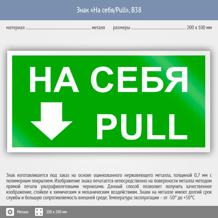 Знак «На себя/Pull», B38 на металле, размером 200х100 мм подсказывает, в какую сторону надо дернуть рычаг или толкнуть дверь. Вспомогательные знаки и таблички полностью соответствуют современным требованиям и стандартам. Таблички с поясняющими надписями используются в качестве самостоятельного знака, либо в качестве дополнения к основному знаку безопасности