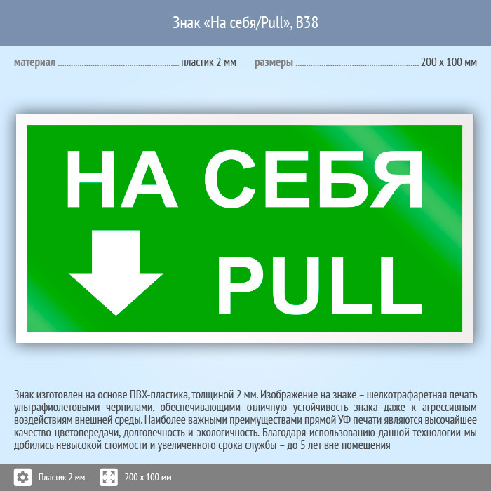 Знак «На себя/Pull», B38 на пластике, размером 200х100 мм подсказывает, в какую сторону надо дернуть рычаг или толкнуть дверь. Вспомогательные знаки и таблички полностью соответствуют современным требованиям и стандартам. Таблички с поясняющими надписями используются в качестве самостоятельного знака, либо в качестве дополнения к основному знаку безопасности