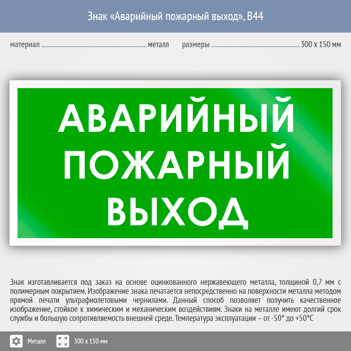 Знак «Аварийный пожарный выход», B44 на металле, размером 300х150 мм обозначает место выхода в случае аварии или пожара. Вспомогательные знаки и таблички полностью соответствуют современным требованиям и стандартам. Таблички с поясняющими надписями используются в качестве самостоятельного знака, либо в качестве дополнения к основному знаку безопасности