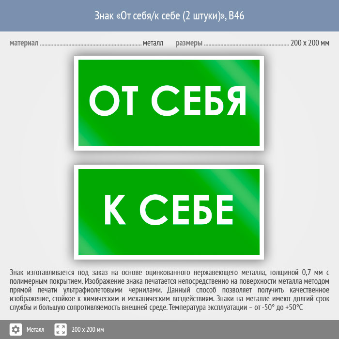Знак «От себя/к себе, B46 (2 штуки) на металле, размером 200х100 мм служит для обозначения открывания двери, в одном комплекте две таблички – на себя и к себе. Вспомогательные знаки и таблички полностью соответствуют современным требованиям и стандартам. Таблички с поясняющими надписями используются в качестве самостоятельного знака, либо в качестве дополнения к основному знаку безопасности