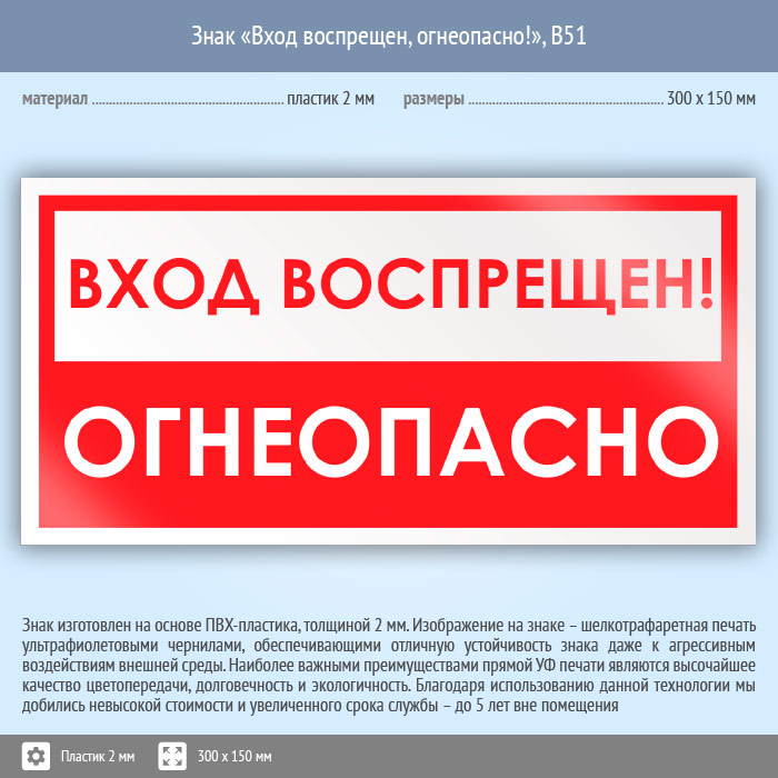 Знак «Вход воспрещен, огнеопасно!», B51 на пластике, размером 300х150 мм служит указанием, что в данное помещение проход запрещен в связи с повышенной опасностью. Вспомогательные знаки и таблички полностью соответствуют современным требованиям и стандартам. Таблички с поясняющими надписями используются в качестве самостоятельного знака, либо в качестве дополнения к основному знаку безопасности