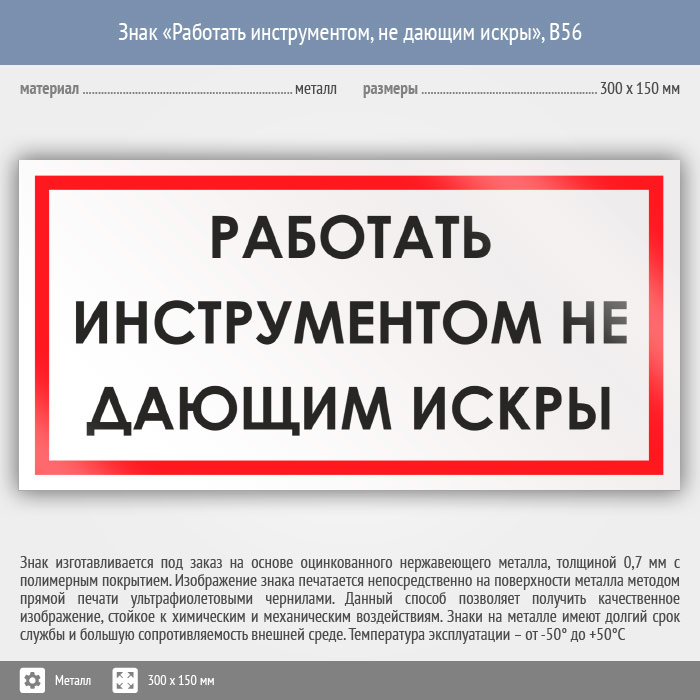 Знак «Работать инструментом, не дающим искры», B56 на металле, размером 300х150 мм обозначает, что в данном месте производство работ огнеопасным инструментом запрещено. Вспомогательные знаки и таблички полностью соответствуют современным требованиям и стандартам. Таблички с поясняющими надписями используются в качестве самостоятельного знака, либо в качестве дополнения к основному знаку безопасности