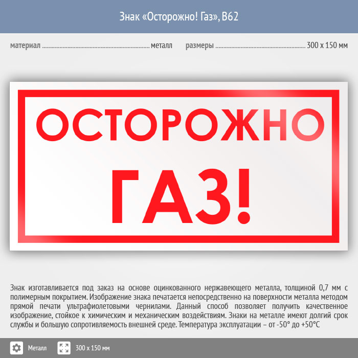 Знак «Осторожно! Газ», B62 на металле, размером 300х150 мм призывает к осторожности, предупреждая о близости газа. Вспомогательные знаки и таблички полностью соответствуют современным требованиям и стандартам. Таблички с поясняющими надписями используются в качестве самостоятельного знака, либо в качестве дополнения к основному знаку безопасности