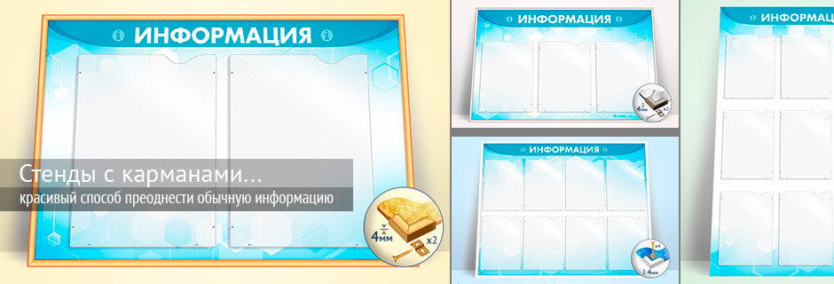 Уважаемые читатели, с радостью сообщаем Вам о расширении нашего ассортимента информационных стендов. Теперь наша коллекция пополнилась стендами с 2, 3, 4, 6, 8, 9, 10 и 12 карманами формата А4. Впрочем если Вам нужен стенд на другое количество карманов или с карманами других форматов - мы его изготовим. На информационных стендах удобно размещать информацию любого характера. Их можно использовать как рекламные щиты или для донесения важной информации для своих сотрудников и клиентов. Такие стенды можно встретить практически в любой организации, начиная от государственных, заканчивая коммерческими. Сегодня даже сложно найти организацию, в которой не был бы размещен хотя бы один стенд с карманами