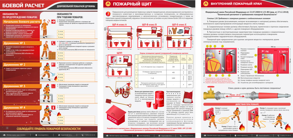 Плакат разработан в соответствии с ФЗ РФ от 22.07.2008 № 123-ФЗ «Технический регламент о требованиях пожарной безопасности» и содержит 128 статью данного документа. Плакат имеет качественные иллюстрации составных частей пожарного щита и действий при пожаре