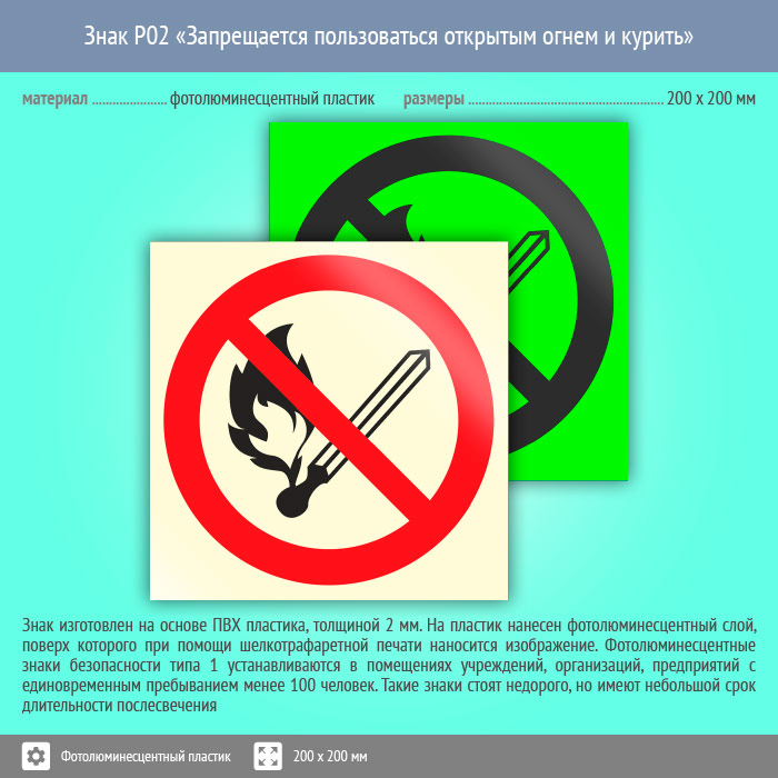 Знак P02 «Запрещается пользоваться открытым огнем и курить» на фотолюминесцентном пластике, размером 200х200 мм обозначает, что использовать огонь и курить в данном месте категорически запрещено. Запрещающие знаки полностью соответствуют требованиям ГОСТ Р 12.4.026-2015 и предназначены для запрещения опасного поведения или действия