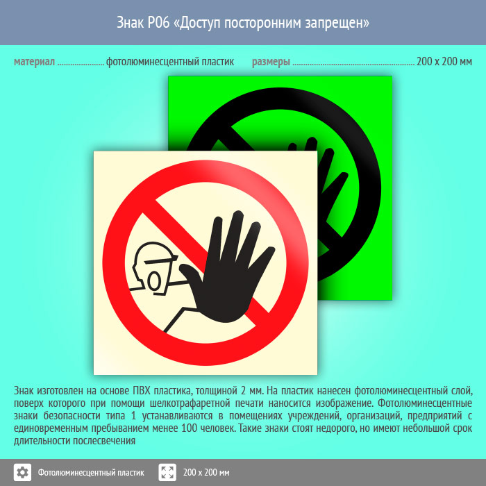 Знак P06 «Доступ посторонним запрещен» на фотолюминесцентном пластике, размером 200х200 мм ограничивает проход посторонних посетителей. Запрещающие знаки полностью соответствуют требованиям ГОСТ Р 12.4.026-2015 и предназначены для запрещения опасного поведения или действия