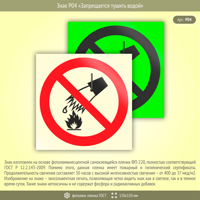 Знак P04 «Запрещается тушить водой» (фотолюминесцентная пленка ГОСТ 34428-2018, 150х150 мм)