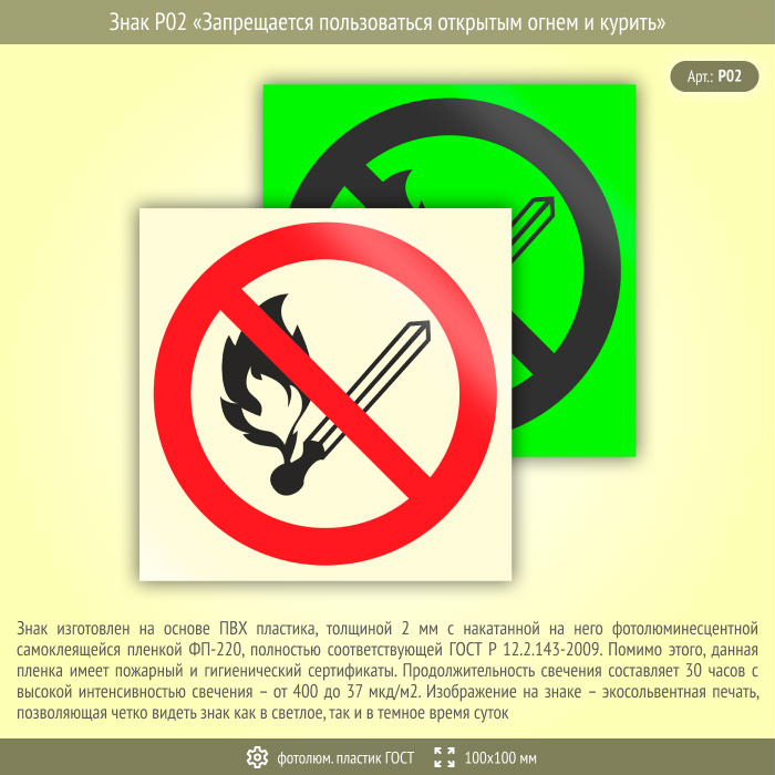 Знак P02 «Запрещается пользоваться открытым огнем и курить» на фотолюминесцентном пластике по ГОСТ 34428-2018, размером 100х100 мм обозначает, что использовать огонь и курить в данном месте категорически запрещено. Запрещающие знаки полностью соответствуют требованиям ГОСТ Р 12.4.026-2015 и предназначены для запрещения опасного поведения или действия