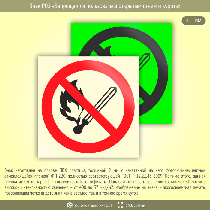 Знак P02 «Запрещается пользоваться открытым огнем и курить» на фотолюминесцентном пластике по ГОСТ 34428-2018, размером 150х150 мм обозначает, что использовать огонь и курить в данном месте категорически запрещено. Запрещающие знаки полностью соответствуют требованиям ГОСТ Р 12.4.026-2015 и предназначены для запрещения опасного поведения или действия