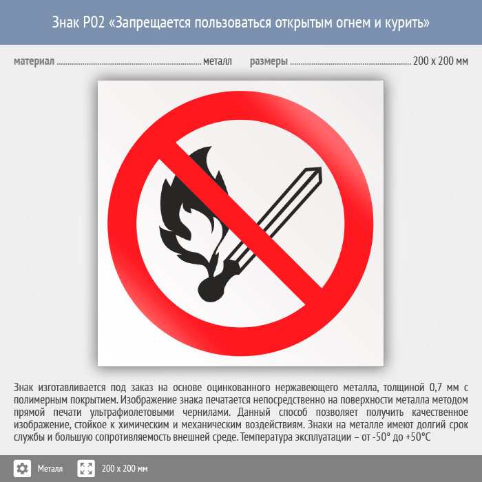 Знак P02 «Запрещается пользоваться открытым огнем и курить» на металле, размером 200х200 мм размещается в местах, где курить категорически запрещено, например, в общественных местах. Запрещающие знаки полностью соответствуют требованиям ГОСТ Р 12.4.026-2015 и предназначены для запрещения опасного поведения или действия