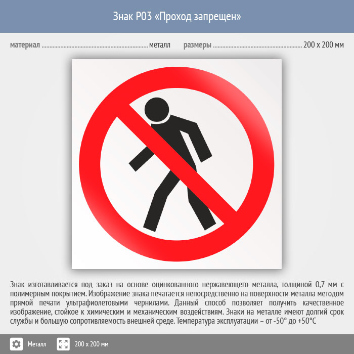 Знак P03 «Проход запрещен» на металле, размером 200х200 мм устанавливается перед опасными зонами, куда несанкционированный доступ и проход запрещены. Запрещающие знаки полностью соответствуют требованиям ГОСТ Р 12.4.026-2015 и предназначены для запрещения опасного поведения или действия
