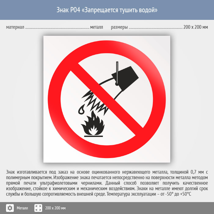Знак P04 «Запрещается тушить водой» (металл, 200х200 мм)