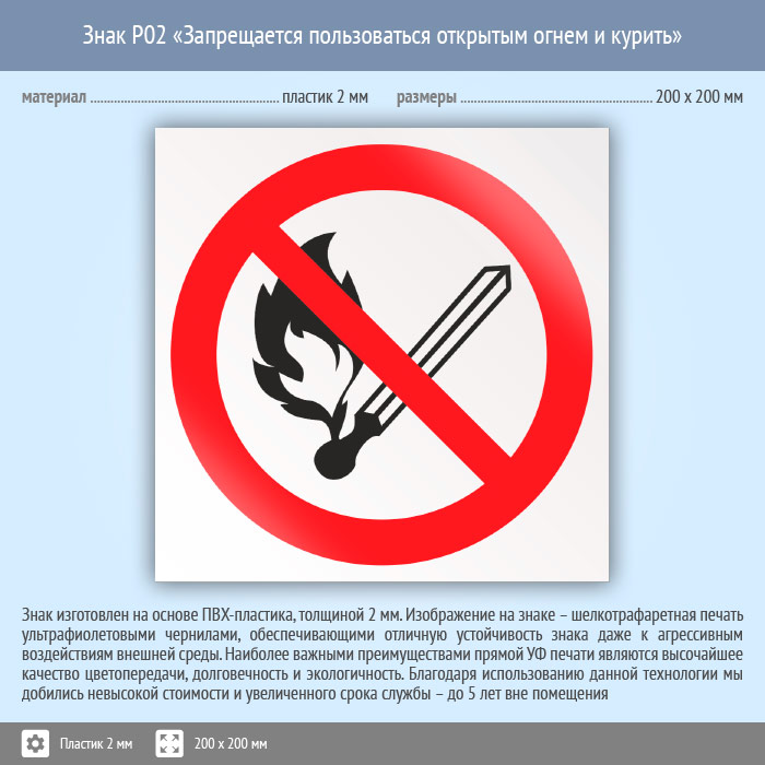 Знак P02 «Запрещается пользоваться открытым огнем и курить» на пластике, размером 200х200 мм размещается в местах, где курить категорически запрещено, например, в общественных местах. Запрещающие знаки полностью соответствуют требованиям ГОСТ Р 12.4.026-2015 и предназначены для запрещения опасного поведения или действия