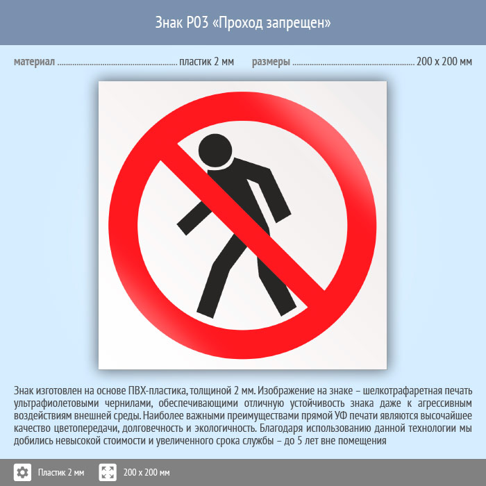 Знак P03 «Проход запрещен» (пластик, 200х200 мм)