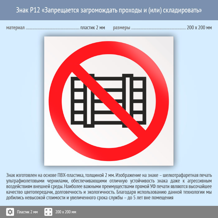 Знак P12 «Запрещается загромождать проходы и (или) складировать» (пластик, 200х200 мм)
