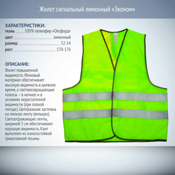 Для обеспечения защиты от несчастных случаев, особенно в условиях плохой видимости (ночное время, неблагоприятные погодные условия) широко используются сигнальные светоотражающие жилеты. Благодаря яркому флуоресцентному материалу лимонного либо оранжевого цвета обеспечивается высокая видимость в светлое время суток, а использование СВП/СОП (световозвращающих/светоотражающих полос) делает жилет хорошо заметным ночью и при плохой видимости. Застегивается жилет на тканевую контактную ленту – застежку-липучку (велкро). С обеих сторон на изделие нашиты светоотражающие ленты, шириной 5 см. Кант выполнен из износостойкой трикотажной тесьмы черного цвета