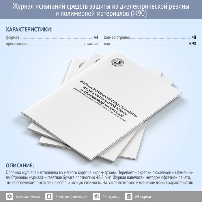 Журнал испытаний средств защиты из диэлектрической резины и полимерных материалов является обязательным учетным документом в организациях, эксплуатирующих электроустановки. Он предназначен для фиксации результатов периодических электрических испытаний диэлектрических средств защиты: перчаток, бот, галош, изолирующих накладок и других изделий из диэлектрической резины и полимерных материалов.
