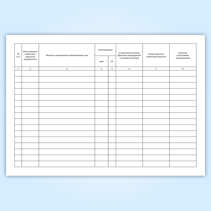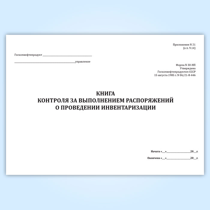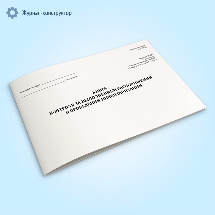 Форма книги контроля за выполнением распоряжений о проведении инвентаризации соответствует Приложению 21 к Инструкции о порядке поступления, хранения, отпуска и учета нефти и нефтепродуктов на нефтебазах, наливных пунктах и автозаправочных станциях системы Госкомнефтепродукта СССР.