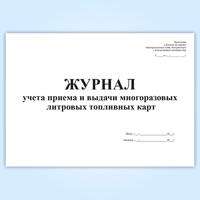 Форма журнала учета приема и выдачи многоразовых литровых топливных карт соответствует Приложению к Договору на заправку нефтепродуктами и мойку автотранспорта с использованием топливных карт