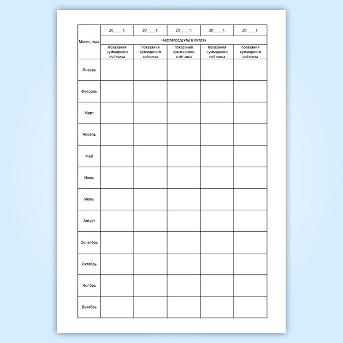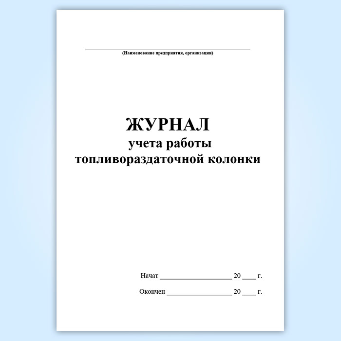 Форма журнала учета работы топливораздаточной колонки соответствует Приложению 3 к Приказу Минэнерго РФ № 229 РД 153-39.2-080-01 «Правилам технической эксплуатации автозаправочных станций» от 01.08.2001 (с изменениями и дополнениями от 17.06.2003 года) , а также Приложению Д к ГОСТ Р 58404-2019 "Станции и комплексы автозаправочные. Правила технической эксплуатации".