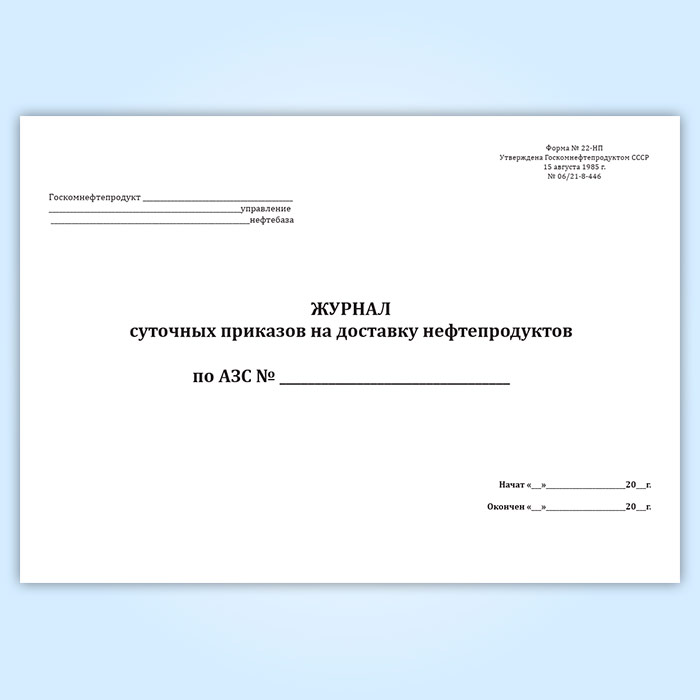 Форма журнала суточных приказов на доставку нефтепродуктов (№ 22-НП) утверждена Госкомнефтепродуктом СССР 15 августа 1985 г. № 06/21-8-446.