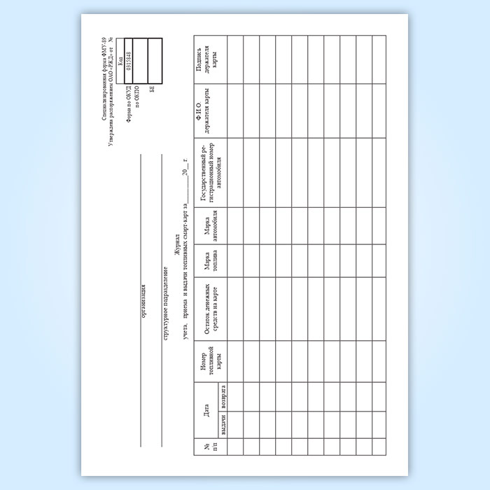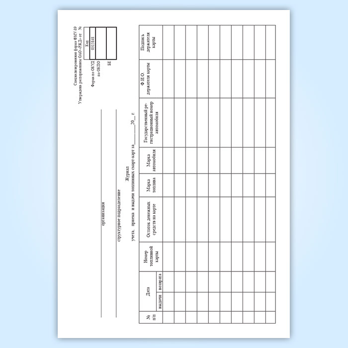 Журнал учета, приема и выдачи топливных смарт-карт имеет графы: