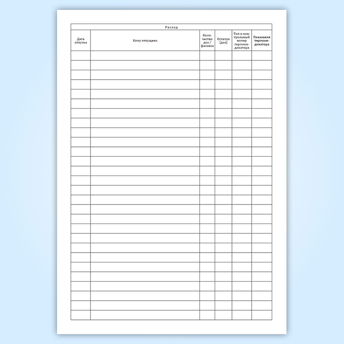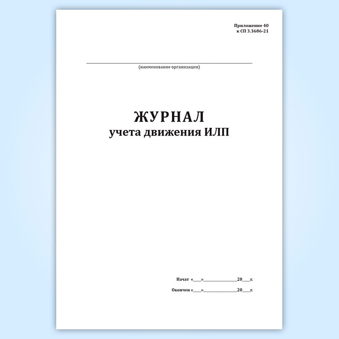 Форма журнала учета движения ИЛП соответствует Приложению 40 к Постановлению Главного государственного санитарного врача РФ от 28.01.2021 № 4 " Об утверждении санитарных правил и норм СанПиН 3.3686-21 " Санитарно-эпидемиологические требования по профилактике инфекционных болезней" .