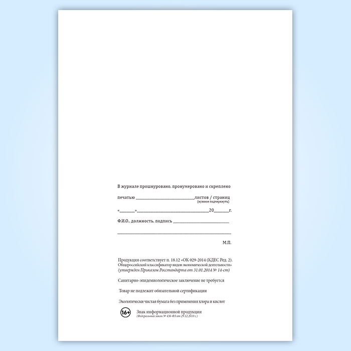 Вы получаете печатную продукцию прошнурованной и c местом для вашей печати в соответствии с действующими нормативными документами:
