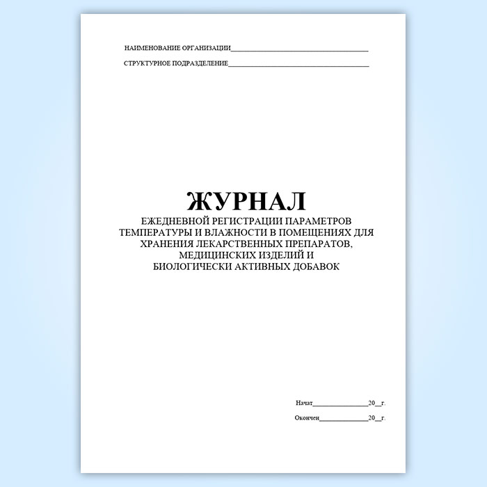 Журнал ежедневной регистрации параметров температуры и влажности в помещениях для хранения лекарственных препаратов, медицинских изделий и биологически активных добавок входит в комплект обязательных журналов для аптек согласно Правил надлежащей аптечной практики лекарственных препаратов для медицинского применения.
