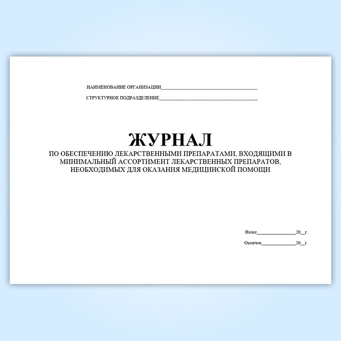 Журнал по обеспечению лекарственными препаратами, входящими в минимальный ассортимент лекарственных препаратов, необходимых для оказания медицинской помощи входит в комплект обязательных журналов для аптек согласно Правил надлежащей аптечной практики лекарственных препаратов для медицинского применения.