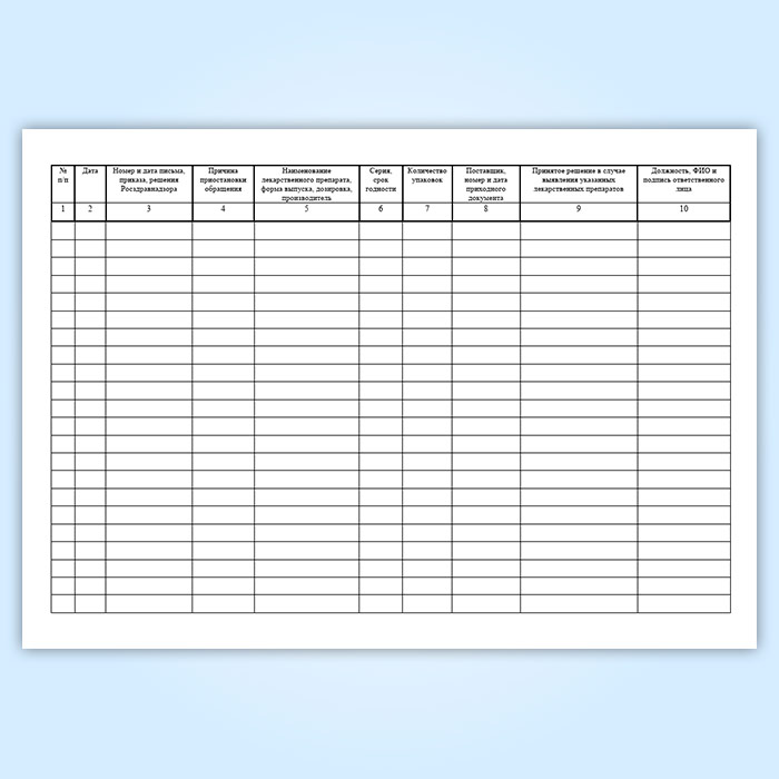 В настоящее время форма журнала регистрации забракованных, фальсифицированных лекарственных препаратов не регламентирована действующим законодательством, а значит, аптечные организации и индивидуальные предприниматели самостоятельно выбирают удобную для них форму данного журнала.