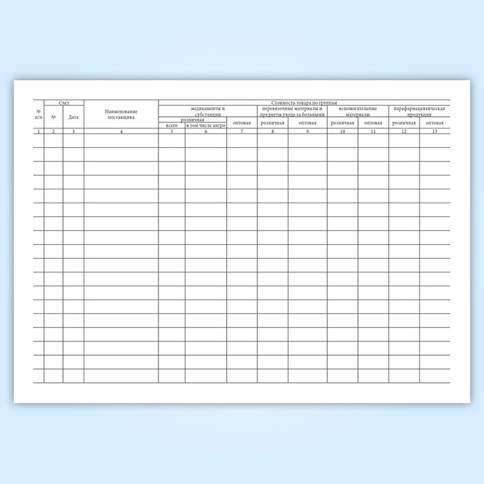 В журнале регистрации счетов поступления товаров по группам ведется учет поступления товаров в аптеку. Журнал служит основным документом для составления отчета.