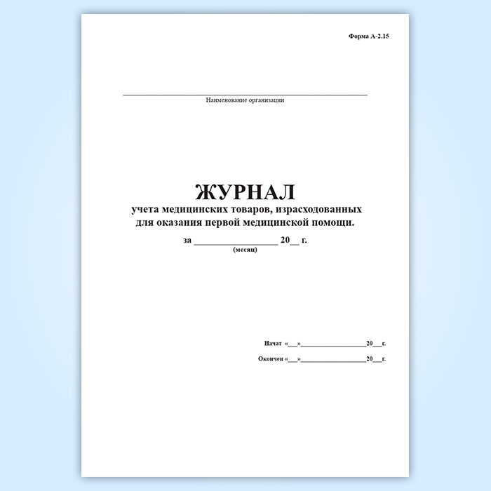 Форма журнала учета медицинских товаров, израсходованных для оказания первой медицинской помощи (№ А-2.15) утверждена Методическими рекомендациями о внутриведомственном первичном учете лекарственных средств и других медицинских товаров в организациях розничной фармацевтической (аптечной) сети всех организационно-правовых форм, расположенных на территории Российской Федерации