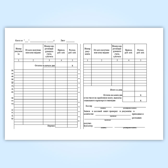 Учет поступающих в кассу (выдаваемых из кассы) наличных денег и денежных документов ведут в кассовой книге (форма 0310004). Регистрация в кассовой книге операций с наличными денежными средствами в рублях, иностранной валюте и денежных документов осуществляется на отдельных листах кассовой книги: по операциям в рублях; по видам иностранных валют.