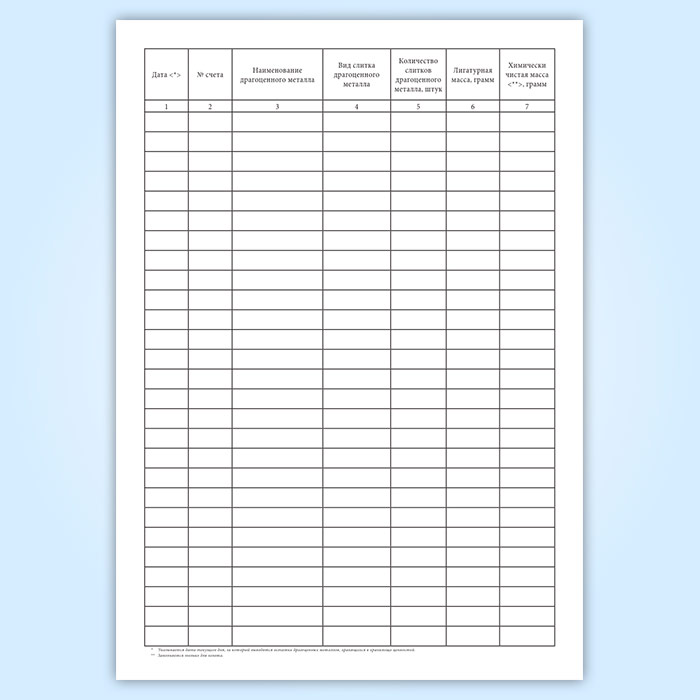 Графы книги учета драгоценных металлов: